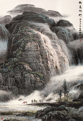 我曾在太行山參觀過八路軍革命遺址,又為太行大壑氣勢所震撼,它象征著中華民族堅強有力的脊梁。我創作的山水畫《飲馬太行》中,雄偉的山崖上有清晨陽光的照耀,正適合我所創的“光感皴法”的表現,又通過描繪點景人物八路軍戰士身背馬槍溜馬飲水的片刻,讓人們感受到勝利的希望。畫面充滿積極向上的精神,注重造型的力量感和恰當筆墨的運用,充滿蓬勃的力量和豐滿的美感。