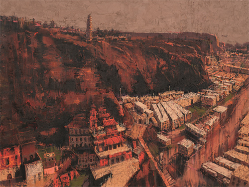 作品《紅色革命》勾勒了延安的一角,左上區(qū)域是一座粗獷的山體,延安塔高高聳立在那里,下面則是幾排低矮的樓房,一直向右方延伸開去。