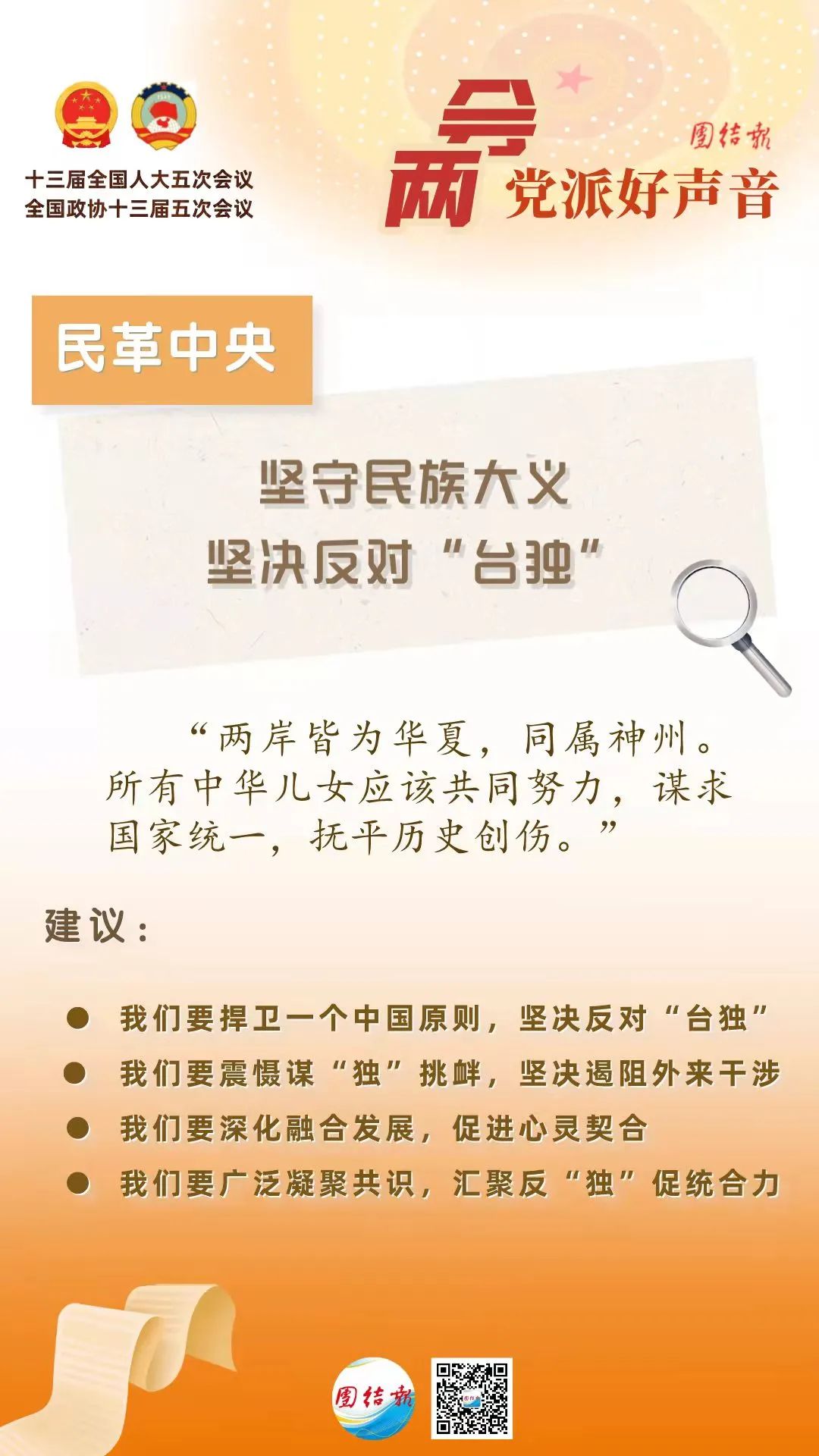 ——我們要廣泛凝聚共識,匯聚反“獨”促統合力。祖國完全統一,是全體華夏兒女的共同心愿。強國有我、統一有我,是包括兩岸同胞在內的全體中華兒女的共同責任。海內外中華兒女要堅定信心、不懈努力,共擔民族大義,匯聚起實現祖國統一、民族復興的磅礴偉力。