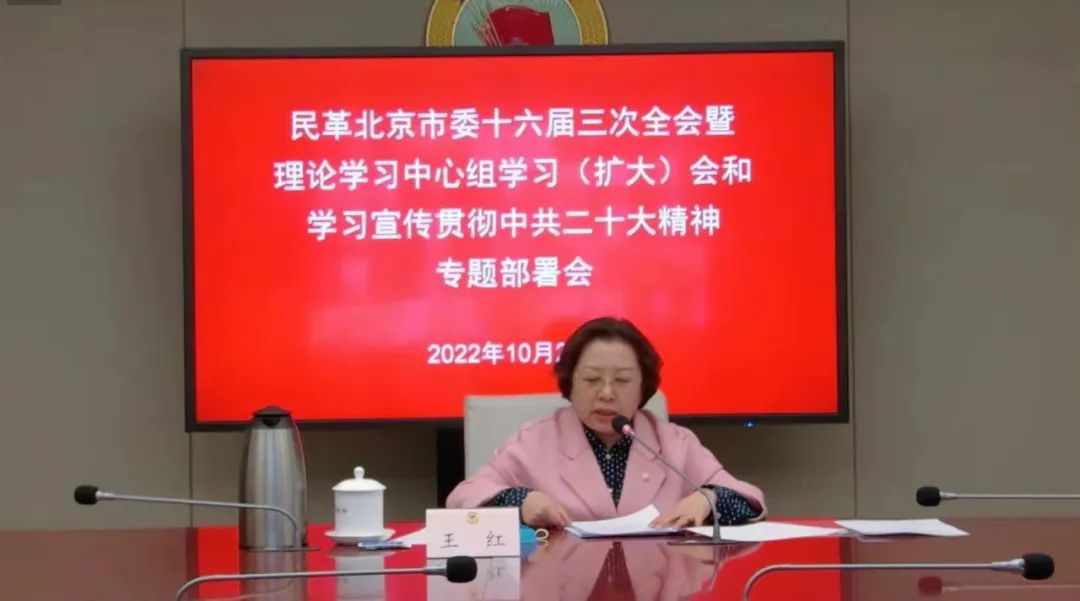 王紅就民革北京各級組織和廣大民革黨員學習宣傳貫徹中共二十大精神提出明確要求:一要深刻認識中共二十大的重大意義,把深入學習宣傳貫徹中共二十大精神作為民革北京市委會當前和今后一個時期首要的政治任務。二是迅速掀起學習宣傳貫徹中共二十大精神熱潮,通過學原文悟原理、開展宣講和培訓、組織理論研究闡釋、舉辦各類學習活動等多種形式,使中共二十大精神深入到各級組織、深入到每個黨員,實現全覆蓋。三是將學習宣傳貫徹二十大精神成果轉化為強化自身建設和做好參政履職的強大動力和實際成效。要完成好全年目標任務,確保圓滿收官;要結合學習二十大精神,謀劃好明年工作;要深入開展調查研究,全面提升履職本領;要嚴明政治紀律和政治規矩,不斷提高政治判斷力、政治領悟力、政治執行力。