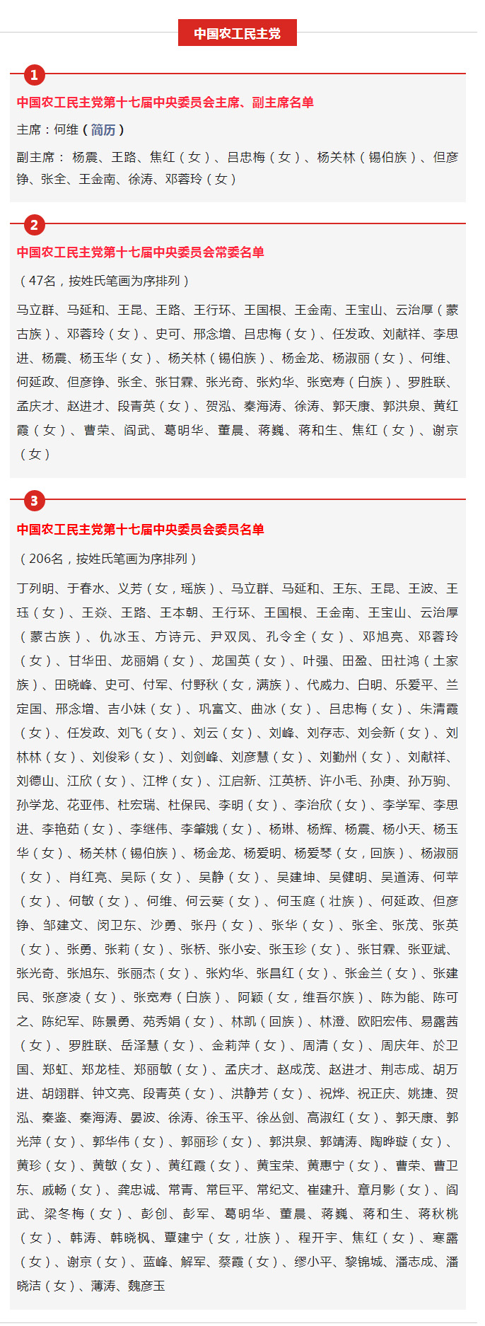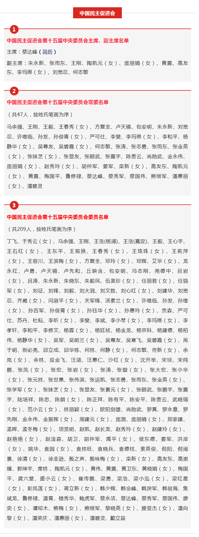 12月23日,隨著中國民主同盟第十三次全國代表大會在京閉幕,我國8個民主黨派全國代表大會圓滿結束。在半個多月時間里,各民主黨派深入學習貫徹中共二十大精神、聽取和審議本黨派中央委員會工作報告、修訂本黨派章程、選舉產生新一屆中央領導機構等,圓滿完成代表大會各項議程,順利實現領導班子新老交替和政治交接。在中共二十大精神的指引下,各民主黨派牢記合作初心、凝聚奮進共識,把多黨合作事業繼續推向前進,鞏固和發展最廣泛的愛國統一戰線,凝聚起共同致力民族復興的磅礴力量。即日起,“統戰新語”和您一道盤點回顧一下各民主黨派全國代表大會的重要信息。今天,帶給您最權威的各民主黨派新一屆中央委員會主席、副主席、常委、委員全名單!快快收藏!