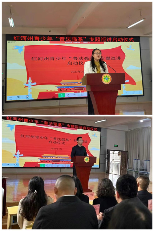 3月6日,紅河州青少年“普法強基”專題巡講活動在紅河州蒙自市第二小學正式啟動。紅河州少工委常務(wù)副主任、共青團紅河州委副書記楊春致辭并宣布紅河州青少年“普法強基”專題巡講正式啟動,民革云南省委會社會服務(wù)處副處長楊洋出席活動并致辭。紅河州教體局、州司法局、民革紅河州委會分管工作的領(lǐng)導出席啟動儀式,中共紅河州委統(tǒng)戰(zhàn)部、州檢察院、蒙自市教體局、蒙自團市委、州青少年發(fā)展基金會、人民能量公益發(fā)展基金會等單位代表參加啟動儀式。