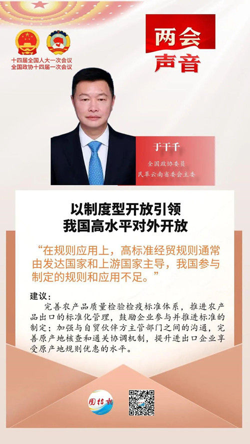 于是在今年全國兩會上,于干千提交了《關于以制度型開放引領我國高水平對外開放的建議》。他建議強化自貿試驗區在制度創新上的重要載體功能和定位,持續推進首創性、集成性、差異化改革創新。完善農產品質量檢驗檢疫標準體系,推進農產品出口的標準化管理,鼓勵企業參與并推進標準的制定。探索實施靈活、多樣、透明的管理措施,例如變“禁止準入”為設置特別篩選程序等。