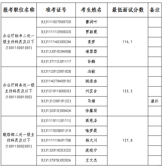因部分考生自愿放棄面試資格,根據關于公務員招考面試工作的有關規定,按照公共科目筆試成績從高到低的順序遞補考生進入面試名單,并相應調整職位面試最低分數線。面試人員名單如下(以準考證號排序):