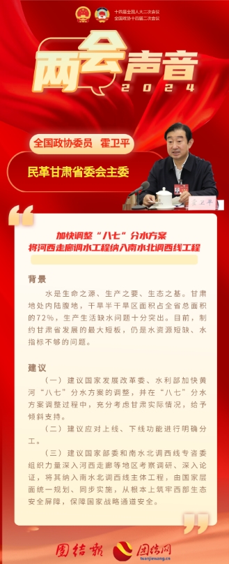 水是生命之源、生產之要、生態之基。甘肅地處沙漠分布區與黃土高原區,干旱半干旱區面積占全省總面積的72%,區域自然資源稟賦差,用水困難問題突出。如何解決甘肅高質量發展的缺水問題,是全國政協委員、民革甘肅省委會主委霍衛平關注的重點問題,今年他提交的《關于加快調整黃河“八七”分水方案,保障黃河上游高質量發展的建議》《關于加快南水北調西線工程建設的建議》《關于將河西走廊調水工程納入南水北調西線工程規劃的建議》,全部與此相關。