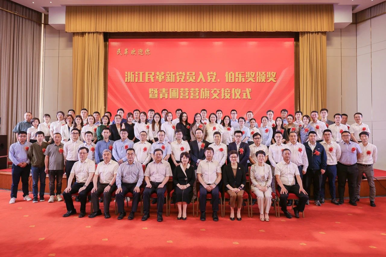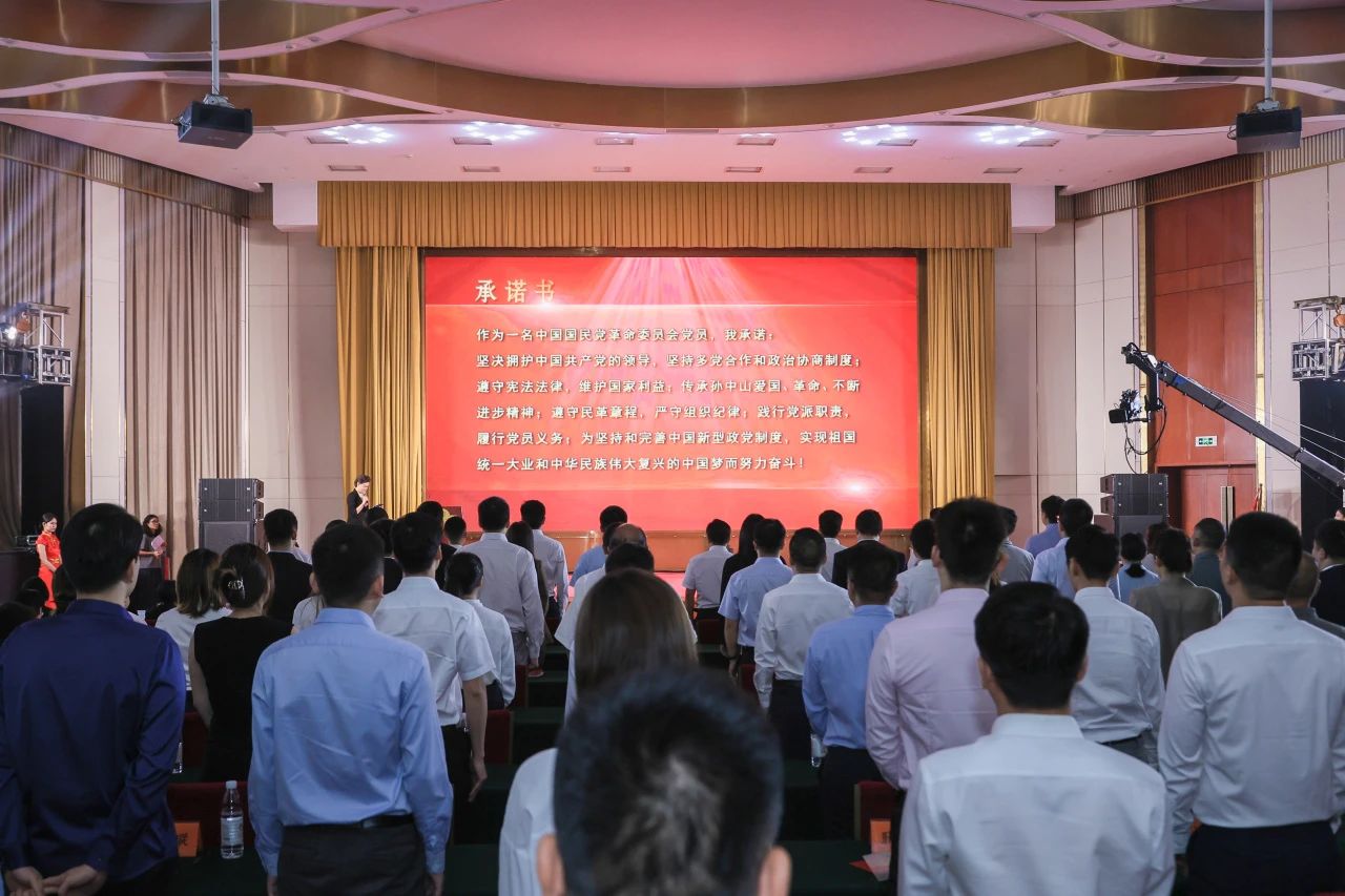 民革中央專職副主席谷振春,民革中央辦公廳一級巡視員、團結報社社長邵丹峰,民革浙江省委會主委吳晶,民革浙江省委會副主委劉凈非、林革、金珊、章獻民、徐銘恩、朱法君同志上臺為新黨員頒發入黨通知書和《中國國民黨革命委員會章程》。