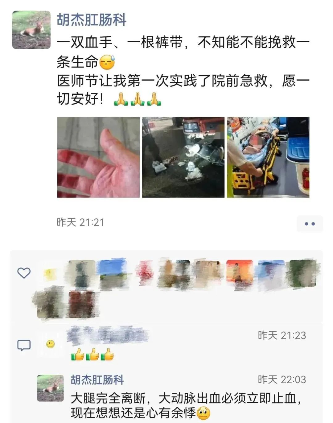 事后,胡杰通過多方打聽,得知患者搶救成功且生命體征穩定,這讓他感到十分慶幸,他在朋友圈這樣記錄:“命算是保住了,看來昨天的處置還是得當的。”在醫師節當天,胡醫生通過朋友圈分享了自己院前急救的真切感受,文字雖然簡短,但他作為醫者的果敢與擔當精神卻深深地感染每一個人。
