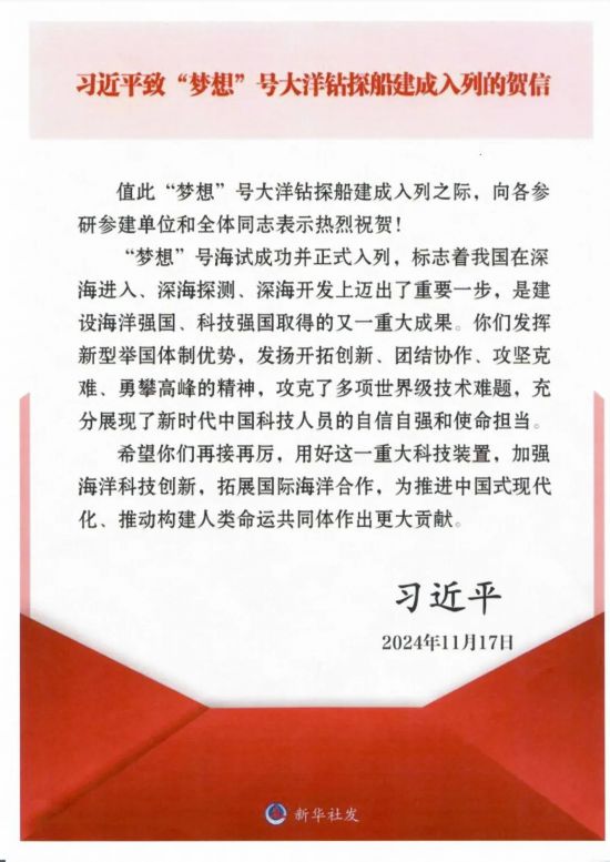 11月17日,我國自主設計建造的首艘大洋鉆探船“夢想”號在廣東廣州正式入列,標志著我國深海探測關鍵技術裝備取得重大突破。中共中央總書記、國家主席、中央軍委主席習近平發來賀信,表示熱烈祝賀。習近平總書記在賀信中指出,“夢想”號海試成功并正式入列,標志著我國在深海進入、深海探測、深海開發上邁出了重要一步,是建設海洋強國、科技強國取得的又一重大成果。