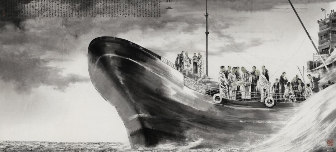 孔維克的《北上》就是這類主題性書畫作品的代表。1949年1月7日,李濟深等民主人士乘坐輪船由香港北上登陸大連,并轉道沈陽奔赴北京參與協商建國,這是民革黨史上的一個重大事件,但美術界長期無人畫過這一題材。2023年,為紀念中共中央頒布“五一口號”75周年,受民革中央主要領導同志委托,民革中央畫院院長孔維克專門去大連搜集資料,精心創作了《北上》這幅畫。該作以一艘奮力沖破黑暗的船為主要意象,并藝術性地將“北上”中的關鍵人物(八個民主黨派的主要人物)以及歷史記載中的重要細節濃縮在一艘船上,象征著民主黨派與中國共產黨“風雨同舟”、奔向光明。該畫在第三屆“風雨同舟”民革全國書畫作品展展出時獲得良好反響,諸多專家學者紛紛在畫前駐足良久并高度評價。最終這幅畫被民革中央收藏。