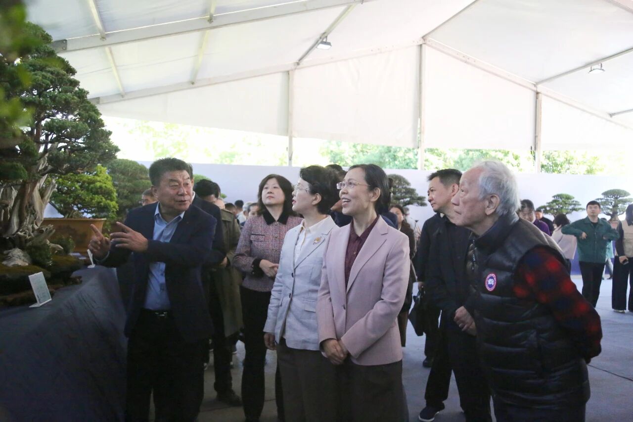 開幕式后,與會領導嘉賓前往盆景藝術展區,參觀兩岸盆景藝術家帶來的200余件匠心之作。